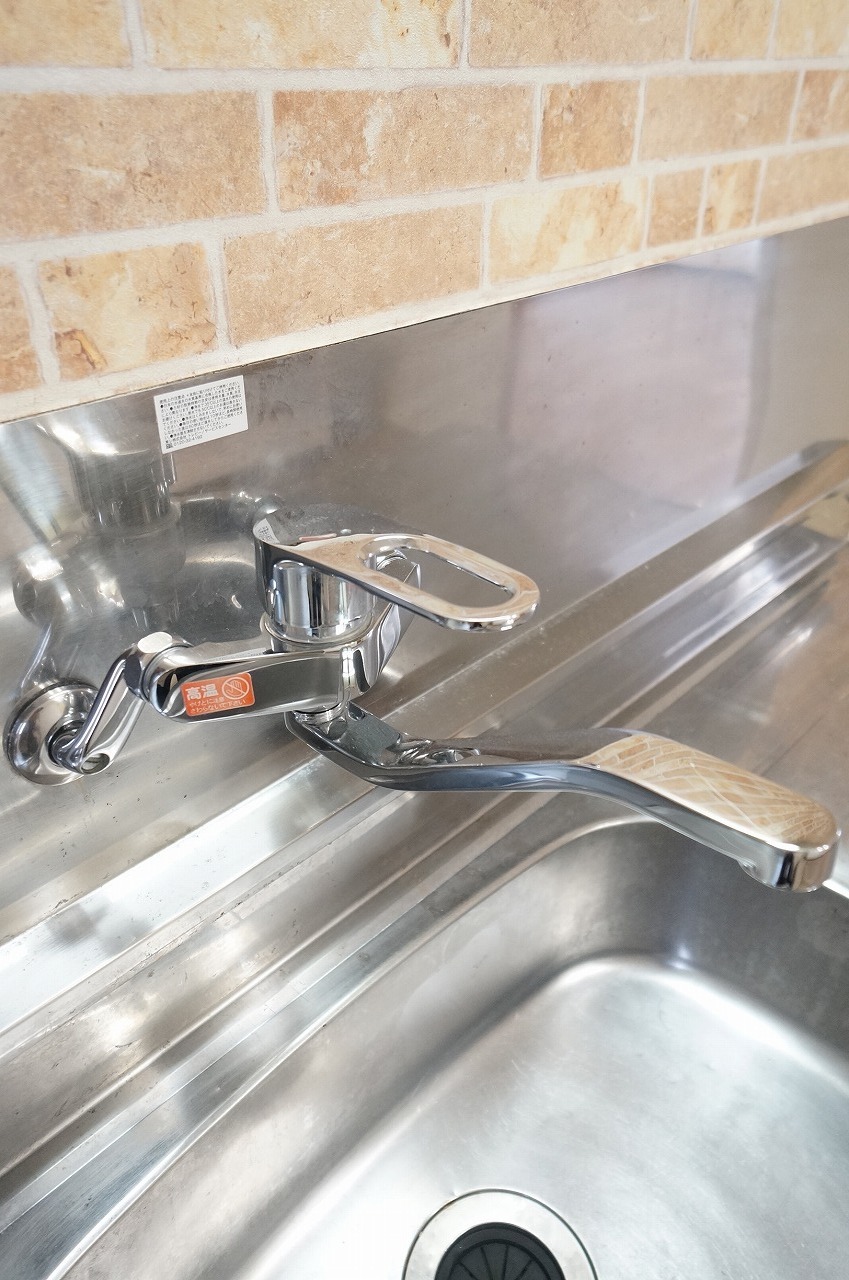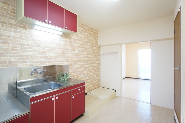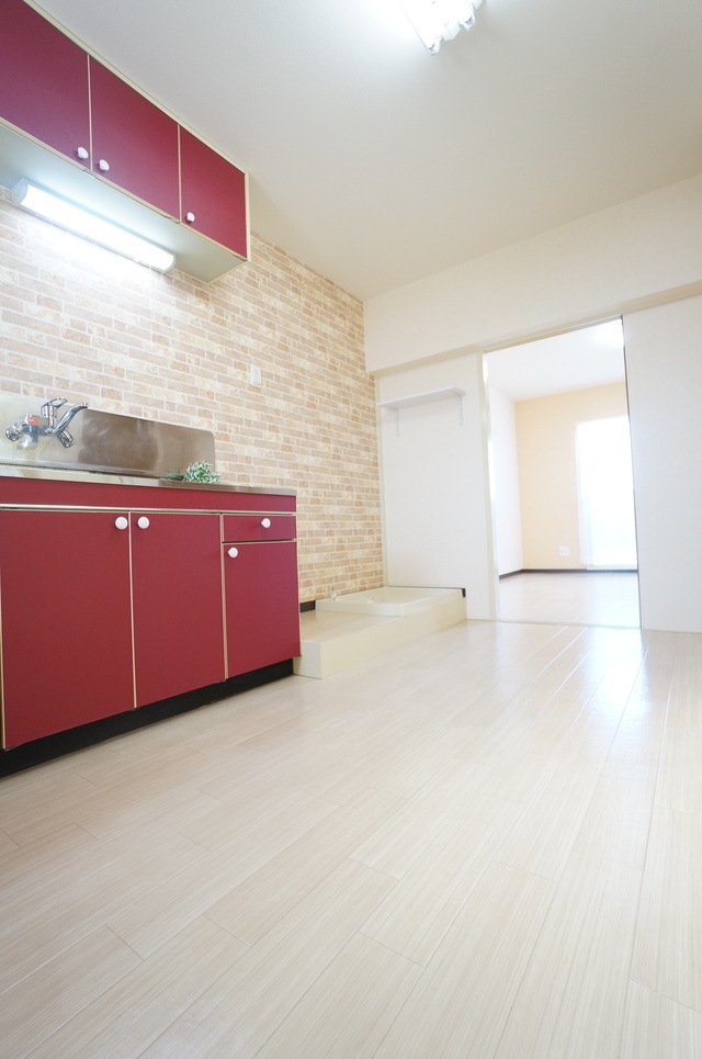 キッチン扉のワイン色と、キッチン正面のレンガ柄が印象的。