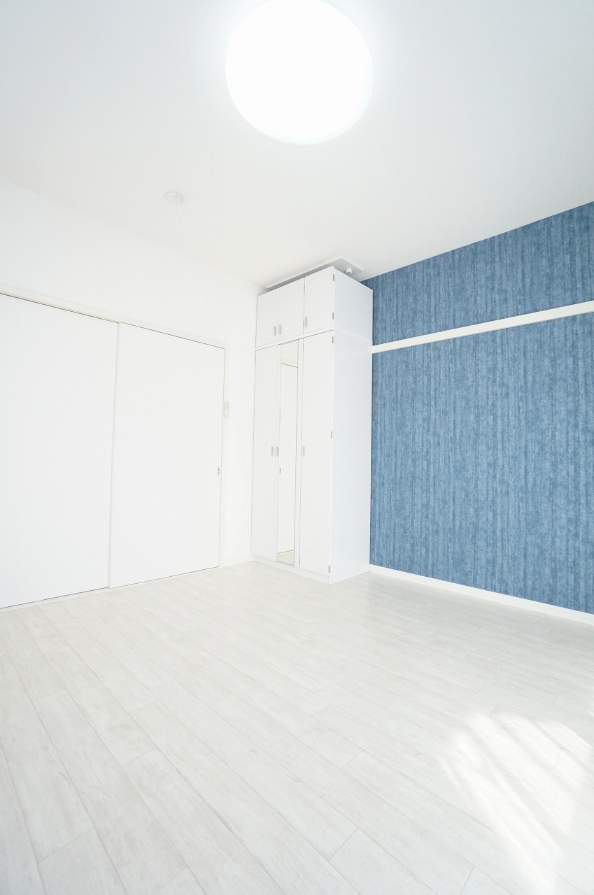 白地にブルーのアクセントクロスが爽やかな印象です。